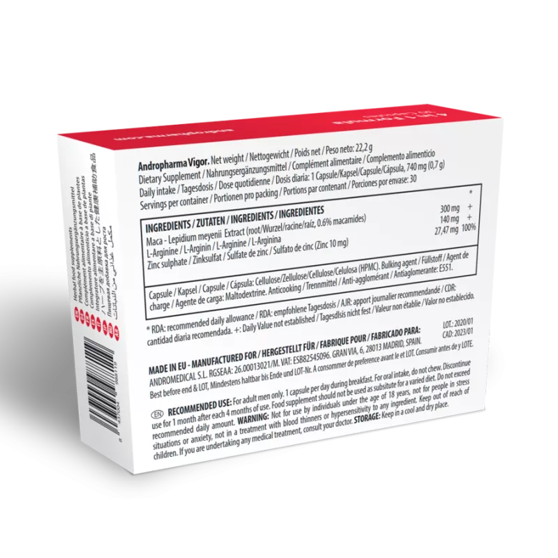 Das Nahrungsergänzungsmittel Andropharma Vigor hilft, die Libido zu steigern und das sexuelle Verlangen von Männern zu stimulieren. Verschiedene Inhaltsstoffe wie Maca, Damiana und Zink fördern die Produktion von Testosteron bzw. die Aktivität dieses Hormons und geben dem gesamten Körper Kraft. Testosteron ist ein Schlüsselelement für die sexuelle Entwicklung von Männern. Es stimuliert auch die Reifung der Spermien und beeinflusst die Sameneigenschaften wie die Beweglichkeit.