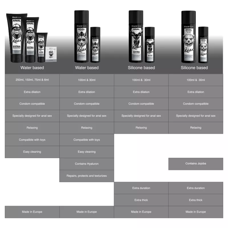 Black Hole, ohne Zweifel die beste Option, Dilatator und Entspannungsmittel, wurde speziell für die Ausübung analer sexueller Beziehungen entwickelt und ist das Dilatator-Gleitmittel schlechthin. Es handelt sich um ein sehr hochwertiges Anal-Gleitmittel, das sowohl für alle, die mit dem Analsex beginnen möchten, als auch für erfahrene Benutzer empfohlen wird. Viele Paare sind neugierig, aber viele trauen sich nicht, es auszuprobieren ... Die Vorstellung, dass es Schmerzen verursachen kann, lässt diese Praxis oft beiseite, da sie eine der angenehmsten ist.