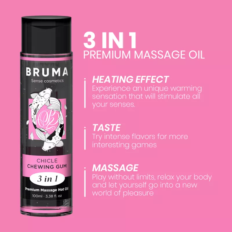 Das Premium Heat Effect Massageöl mit Kaugummigeschmack der Marke BRUMA ist ein wahres Juwel in der Welt des Wohlbefindens und der Intimität. Dieses exquisite Produkt, präsentiert in einem eleganten 100-ml-Behälter, soll ein einzigartiges und sinnliches Erlebnis bieten und eine entspannende und anregende Massage mit einem Hauch von Wärme bieten, die sie noch spezieller macht. Hier die im Detail ausgearbeiteten Highlights: