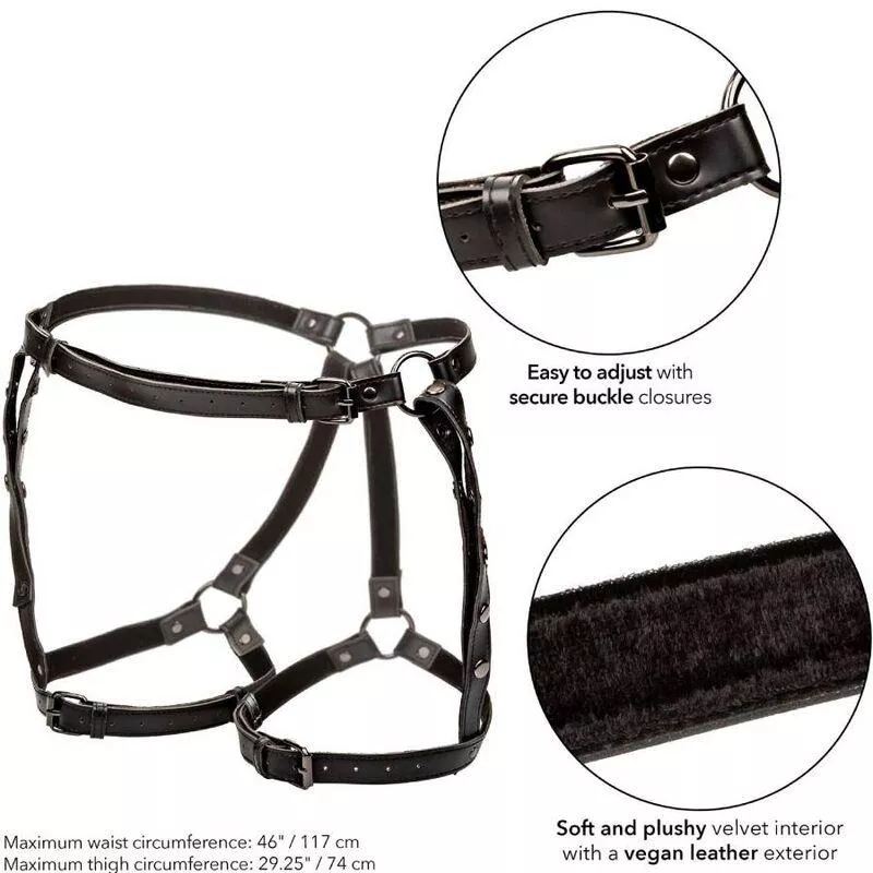 Steigern Sie das Vergnügen mit dem Multi Chain Thigh Harness aus der Euphoria-Kollektion: ein Premium-Accessoire für intensivere Wünsche. Verstellbare Taillen- und Oberschenkelgurte sorgen mit einem einfachen Schnallenverschluss für eine bequeme Passform. Das zeitgemäße Design sorgt für Langlebigkeit und verbessert die Gesamtzufriedenheit. Genießen Sie das luxuriöse Gefühl der weichen Samtinnenseite und den Hauch von Raffinesse der veganen Lederaußenseite. Die robuste Konstruktion mit doppelter Polsterung und Nähten sorgt für Komfort bei leidenschaftlichen Begegnungen. Nicht anlaufende metallische Akzente sorgen für Glamour und sorgen für eine atemberaubende und verlockende Optik. Mit seinem vielseitigen Design passt es in die meisten Standardgrößen. Entfesseln Sie Ihre Wünsche und entdecken Sie neue Ebenen der Aufregung mit dem Collections Multi Chain Oberschenkelgeschirr