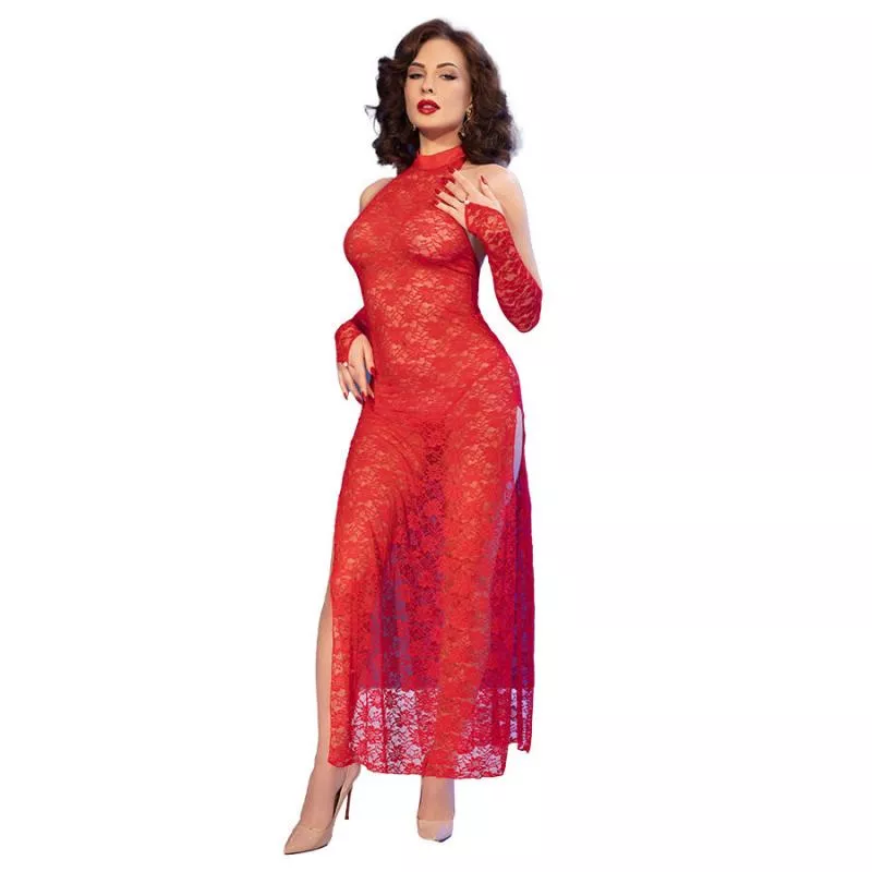 Die verspielten Seitenschlitze, die bis zu den Hüften reichen, sorgen für einen gewagten Twist und bieten sowohl Faszination als auch Bewegungsfreiheit – perfekt, um einen beeindruckenden Eindruck zu hinterlassen.Elegante Spitzenhandschuhe runden den Look ab und verleihen ihm Raffinesse und Geheimnis.