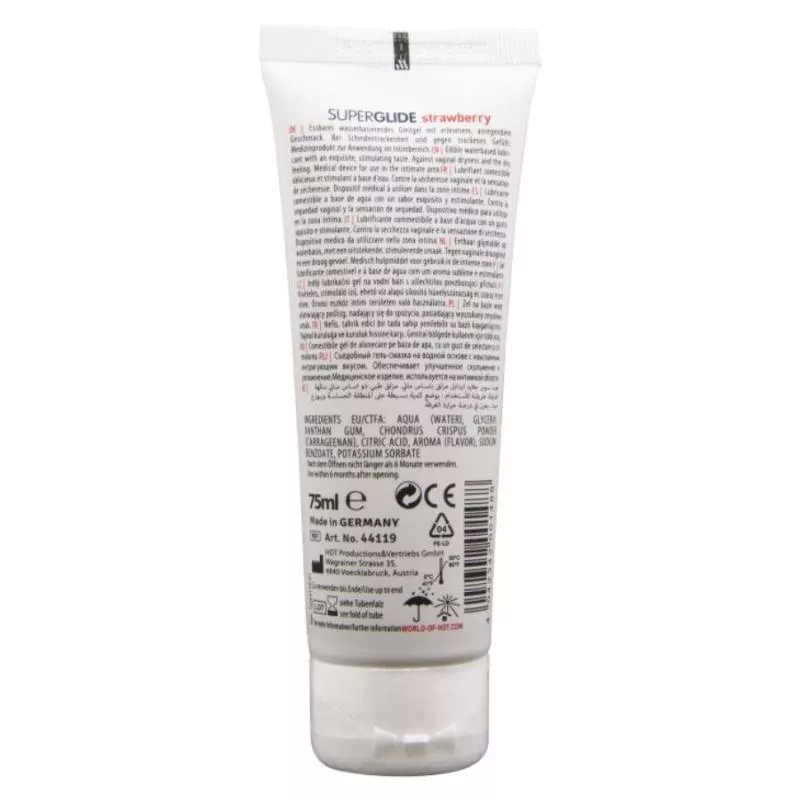 Ein 100% essbares Gleitgel! Dieses Gel auf Wasserbasis hat einen köstlichen Erdbeergeschmack und wurde entwickelt, um Ihre intimen Momente in ein süßes und leidenschaftliches Erlebnis zu verwandeln.
