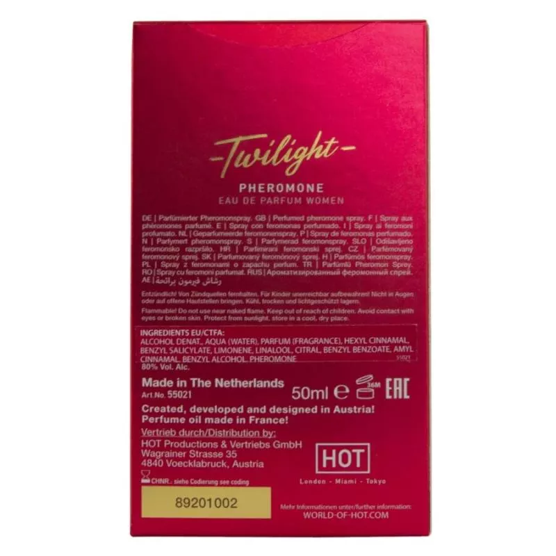Alcohol Denat., Aqua (Water), Parfum (Fragrance), Hexyl Cinnamal, Benzyl Salicylate, Limonene, Linalool, Citral, Benzyl Benzoate, Amyl Cinnamal, Benzyl Alcohol, Geraniol, Farnesol, Eugenol, Pheromone.
