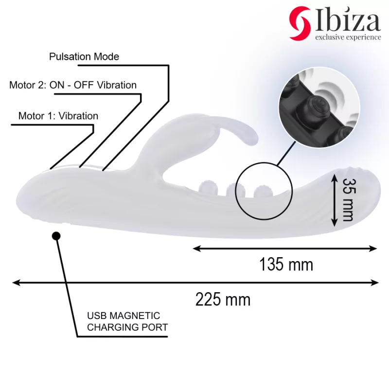 Lassen Sie sich vom eleganten Design und der leisen Kraft des IBIZA Pulsating Rabbit Vibrators verführen, einem technologischen Juwel, das entwickelt wurde, um Lust auf personalisierte, tiefe und absolut sichere Weise zu erleben. Dieses Spielzeug wurde entwickelt, um G-Punkt und Klitoris gleichzeitig zu stimulieren und kombiniert den legendären „Rabbit“-Stil mit innovativen Funktionen, die Sie vom ersten Gebrauch an zum Vibrieren bringen – im wahrsten Sinne des Wortes.
