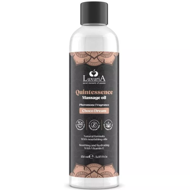Quintessence Massageöl, Schokolade Dies ist ein natürliches und raffiniertes Massageöl, angereichert mit exklusiven Formulierungen auf Basis hochwertiger Öle und sorgfältig ausgewählter stimulierender Essenzen. Seine nährende Formel aus völlig natürlichen Pflanzenölen in Kombination mit sinnlichen Aromen spendet intensive Feuchtigkeit und macht die Haut weich und duftend. Das paraffinfreie Quintessence Massageöl respektiert und schützt die Haut dank des enthaltenen Hanfsamenöls und stimuliert Ihre Sinne mit sanften Puderzuckernoten, die Sie während der gesamten Massage begleiten und Sie zur Quintessenz des Vergnügens führen.