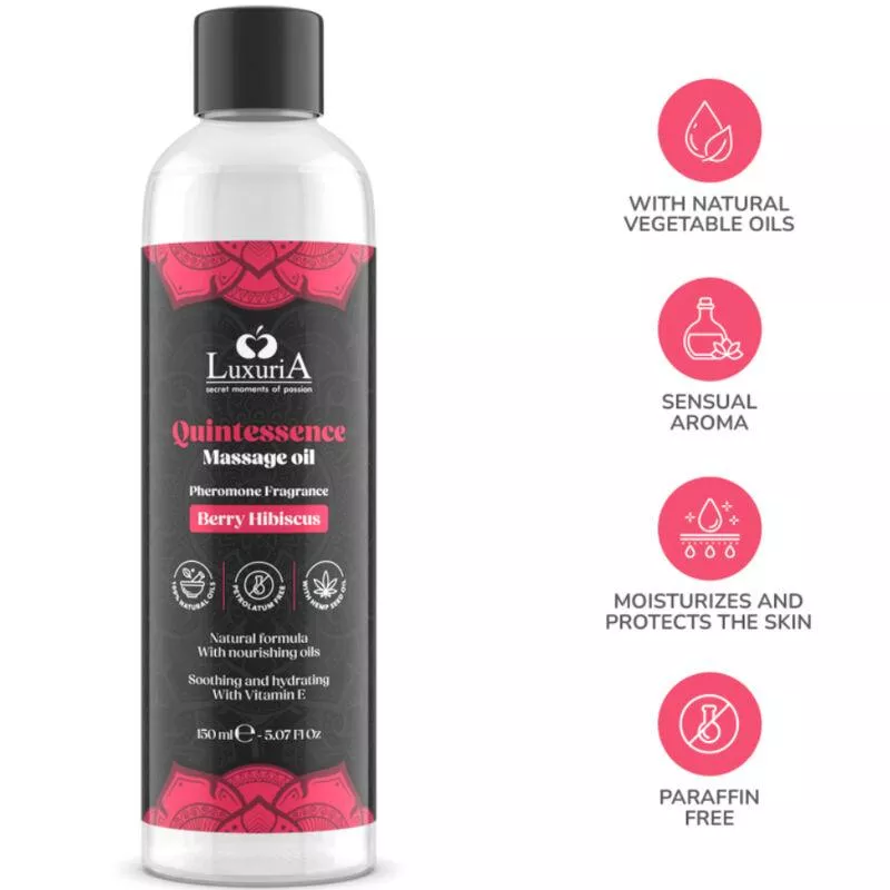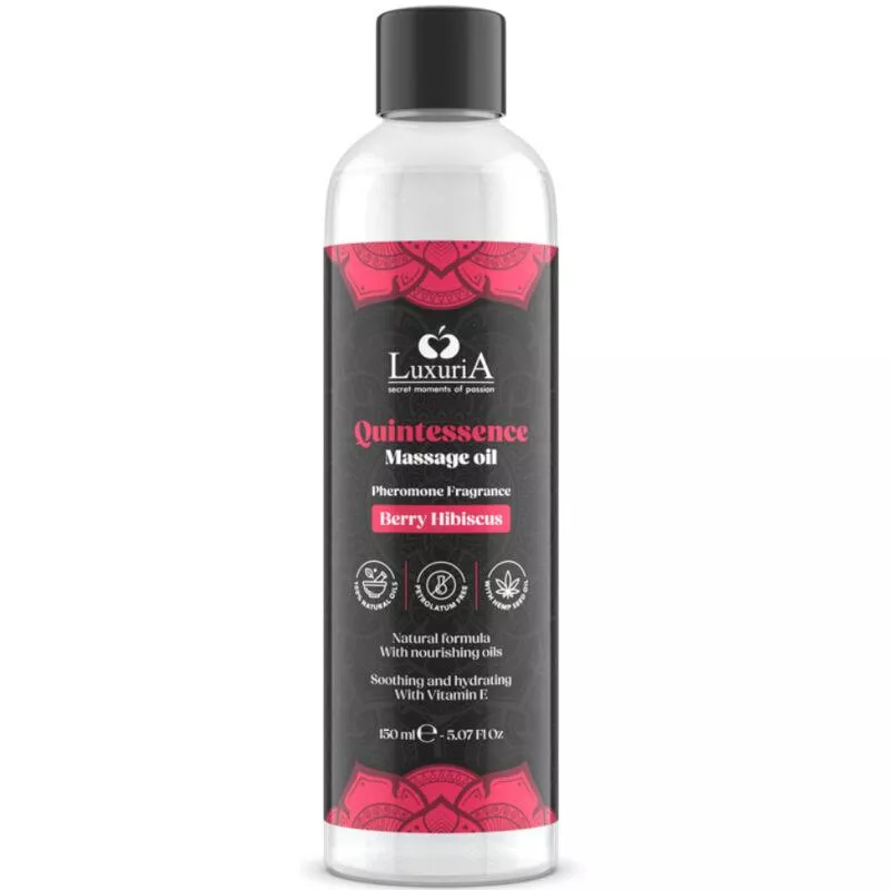 Quintessence Massageöl, Berry Dies ist ein natürliches und raffiniertes Massageöl, angereichert mit exklusiven Formulierungen auf Basis hochwertiger Öle und sorgfältig ausgewählter stimulierender Essenzen. Seine nährende Formel aus völlig natürlichen Pflanzenölen in Kombination mit sinnlichen Aromen spendet intensive Feuchtigkeit und macht die Haut weich und duftend. Das paraffinfreie Quintessence Massageöl respektiert und schützt die Haut dank des enthaltenen Hanfsamenöls und stimuliert Ihre Sinne mit sanften Puderzuckernoten, die Sie während der gesamten Massage begleiten und Sie zur Quintessenz des Vergnügens führen.