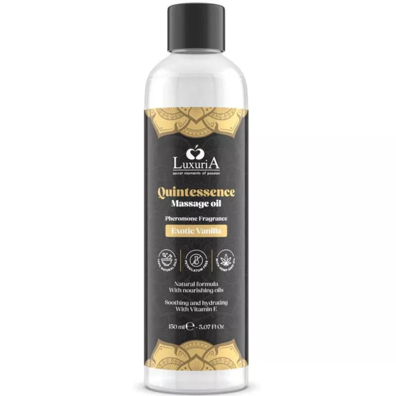 Quintessence Massageöl, Exotic Vainilla Dies ist ein natürliches und raffiniertes Massageöl, angereichert mit exklusiven Formulierungen auf Basis hochwertiger Öle und sorgfältig ausgewählter stimulierender Essenzen. Seine nährende Formel aus völlig natürlichen Pflanzenölen in Kombination mit sinnlichen Aromen spendet intensive Feuchtigkeit und macht die Haut weich und duftend. Das paraffinfreie Quintessence Massageöl respektiert und schützt die Haut dank des enthaltenen Hanfsamenöls und stimuliert Ihre Sinne mit sanften Puderzuckernoten, die Sie während der gesamten Massage begleiten und Sie zur Quintessenz des Vergnügens führen.