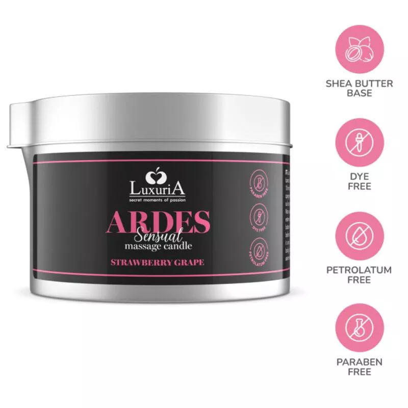 Die Luxuria Ardes Grape/Strawberry Massage Candle ist eine duftende Massagekerze aus Sheabutter, angereichert mit sinnlichen Aromen, um intime Beziehungen zu intensivieren und zu stimulieren. Die straffenden und geschmeidig machenden Eigenschaften der Sheabutter sorgen für Entspannung und Geschmeidigkeit Ihrer Haut. Das berauschende Aroma ihrer Düfte wird Sie in warme und sinnliche Momente voller Leidenschaft und Erregung einhüllen. Ardes wird eine lustvolle Atmosphäre entfachen, die Sie in eine sinnliche Dimension erotischer Lust entführt.