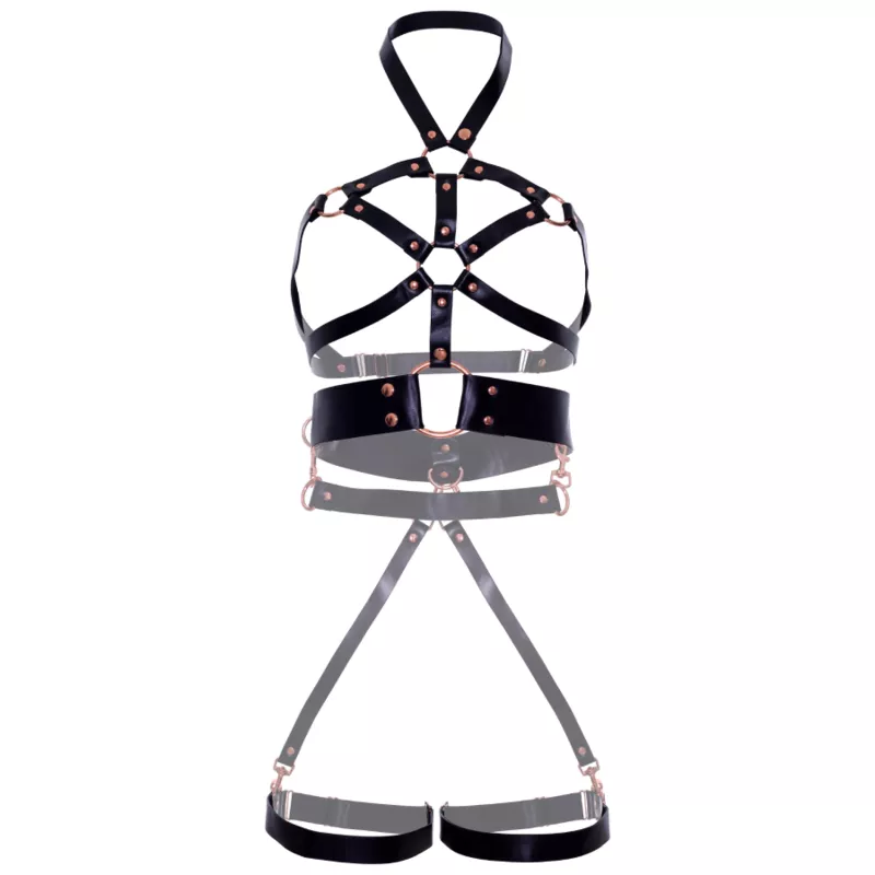 Ergeben Sie sich Ihren Wünschen mit unserem mit O-Ringen besetzten Körpergeschirr aus veganem Leder. Dieses provokante Stück verfügt über gewagte O-Ring-Nieten, befestigte Strumpfhalter und einen abnehmbaren Griff auf der Rückseite. ;Steigern Sie Ihre Sinnlichkeit und Dominanz und machen Sie jeden Moment zu einer Entdeckungsreise von Vergnügen und Kraft. Entfesseln Sie Ihre inneren Wünsche mit Stil.