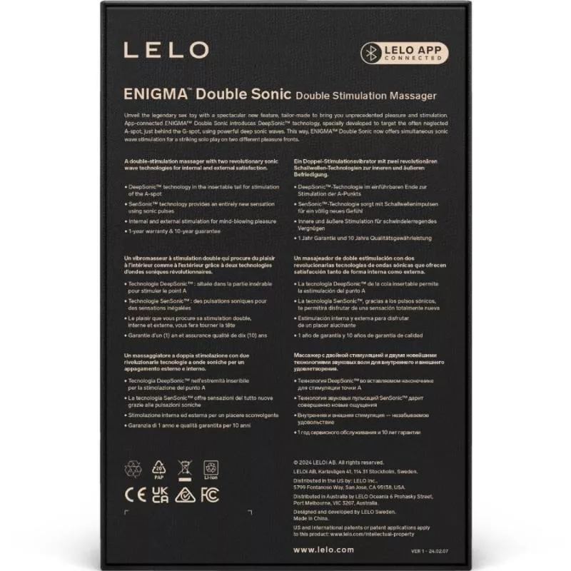 Der ENIGMA™ Double Sonic A-Punkt-Vibrator ist die neueste Ergänzung der LELO ENIGMA™-Reihe. Mit ihm stellen wir Ihnen die DeepSonic™-Technologie vor, die sich auf den oft vernachlässigten A-Punkt konzentriert. Er bietet außerdem acht Lustmodi und zwei weitere exklusive App-Steuerungsmodi, die Sie nutzen können, wenn Sie sich mit der LELO-App verbinden. Dank seiner speziellen Schallspitze im einführbaren Schwanz stimuliert der ENIGMA™ Double Sonic eine größere erogene Zone, um den A-Punkt mit seinen tiefen Schallwellen zu erreichen und Ihnen intensivere vaginale Orgasmen zu bescheren. Er sendet außerdem Schallwellen an die Klitoris sowie Vibrationen an den G-Punkt.
