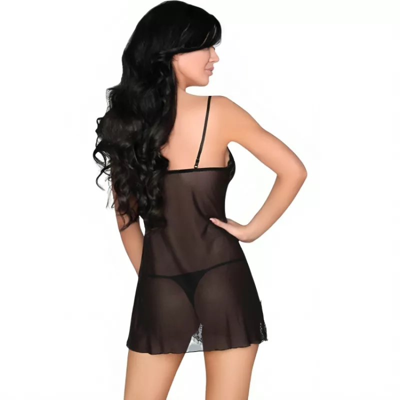 Jede Frau sollte sowohl Alltagskleidung als auch Kleidung für besondere Anlässe im Kleiderschrank haben. Dasselbe gilt für Unterwäsche: Bequem und elegant ist wichtig. Das Set Luise ist ideal für besondere Anlässe: Ein zartes Tüllhemdchen kombiniert mit einem String-Tanga ergibt ein perfektes Nachthemd. Alles in einem zarten, eleganten und zugleich sinnlichen Schwarzton. Das Hemdchenchen ist aus einem angenehm anzufassenden Material gefertigt. Der obere Teil ist mit floraler Spitze verziert. Dieses Modell betont die Brust nicht nur dank der Spitze, sondern auch dank des tiefen Ausschnitts. Abgerundet wird das Set durch einen weichen String mit dünnen Seitenträgern.
