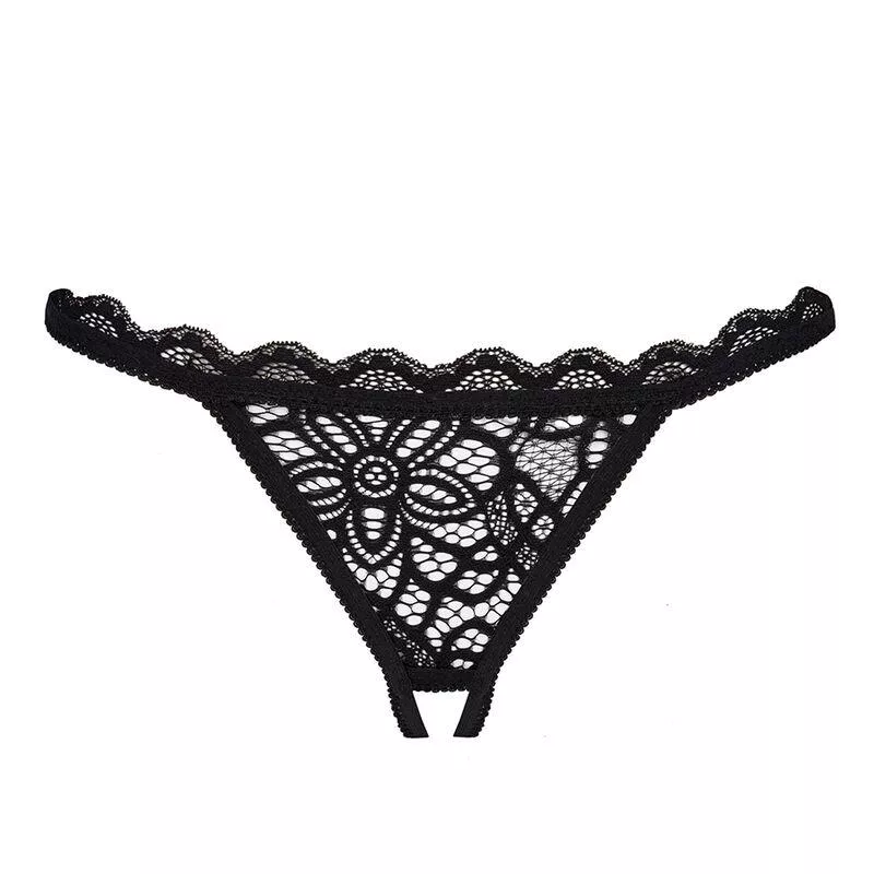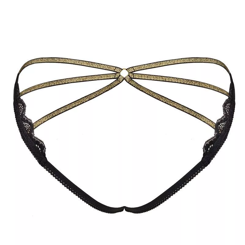 Einzigartige und außergewöhnliche schwarze Höschen verkörpern Weiblichkeit, Sexappeal und Sinnlichkeit. Der nicht sichtbare Rücken, eine Kombination aus dezenter Spitzenverzierung und ausdrucksstarken Trägern, die das Gesäß betonen und hervorheben, verleiht diesem Modell Charakter und unterscheidet es von anderen klassischen Optionen. Auch Panty Muled ist eine Balance zwischen der Zartheit der Spitze und ihrem schwarzen, dunklen Farbton, der teilweise auch durch glänzende Streifen durchbrochen wird. Die Vorderseite, die ebenso wie die Rückseite Spitzenelemente enthält, ist leicht ausgeschnitten, wodurch die unteren Teile des Bauches freigelegt werden können. Die Streifen an den Seiten befinden sich auf der Hüftlinie – sie passen perfekt zu Hosen mit niedriger Taille, wodurch sie sichtbar sind. Dies ist eine ideale Option für stilvolle Frauen, die den neuesten Trends in der Modewelt folgen. Das Material und der Schnitt sorgen für maximalen Tragekomfort der Unterwäsche und machen dieses Modell zwar perfekt für besondere Anlässe, aber auch für den häufigeren Gebrauch geeignet.