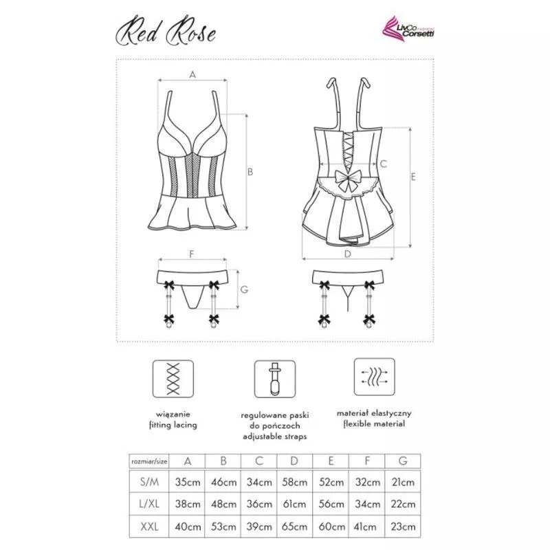 DAS SET BESTEHT AUS 2 TEILEN: KORSETT + Ding Ein beeindruckendes Red Rose-Set, bestehend aus einem einzigartig genähten Hemd und einem Tanga mit Strumpfgürtel. T-Shirt aus Stoff, elegant bestickt mit roten, femininen Mustern. Die Rückseite des Shirts ist länger, gewellt und steht der Figur gut. Etwas höher ein schwarzer Spitzengürtel mit großer Satinschleife. Die Rückseite des T-Shirts wird wie ein Korsett gebunden, sodass das Outfit perfekt zu Ihrer Figur passt. Dickere, rote und schwarze Träger reichen bis zum tief ausgeschnittenen, V-förmigen Busen. Das T-Shirt sitzt eng an der Taille und ist kokett mit vertikalen schwarzen Mustern bestickt, wodurch es optisch schlanker wird und die Aufmerksamkeit auf das Profil der weiblichen Figur lenkt. Strumpfgürtel, verziert mit mittelgroßen Satinschleifen.