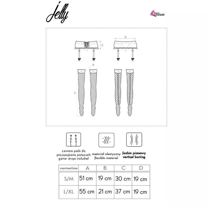 Der Strapsgürtel Jelly ist ein sinnliches Unterwäscheset aus der LivCO Corsetti Fashion-Kollektion. Es enthält einen Strapsgürtel mit Strümpfen. Das Ganze ist in einem eleganten schwarzen Farbton gehalten. Der Strapsgürtel ist aus feiner Spitze gefertigt. Es bedeckt den Körper von der Hüfte bis zur Taille. Durch seine Breite wirkt es äußerst eindrucksvoll und formt optisch die Figur. Der Gürtel verfügt außerdem über vertikale Nähte, die ihm einen räuberischen Charakter verleihen und ihn optisch schlanker machen. Verführerische Dekorationen in Form von diagonalen Einsätzen aus glänzendem Material sind mit silbernen Zierelementen besetzt. Die Vorderseite des Strumpfgürtels wird mit bequemen Haken befestigt. Der verführerisch ausgeschnittene Rücken oberhalb des Gesäßes ist mit einer Korsettschnürung versehen. Netzstrümpfe mit großen Maschen werden mit schmalen, verstellbaren Trägern an der Taille befestigt. Ihr oberer Teil ist mit Spitze mit floralem Ornament verziert. Das Set besteht aus flexiblem Material, das sich der Körperform anpasst und die Figur betont. .