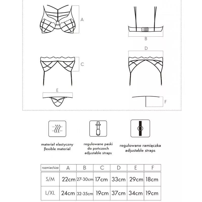 Ein Dessous-Set bestehend aus drei Teilen: BH, Strumpfhalter und Tanga, das sich durch sein elegantes und verführerisches Design auszeichnet. Dieses Set in seiner Gesamtheit ist perfekt für besondere Anlässe und soll die Weiblichkeit mit einem Hauch von Eleganz und Sinnlichkeit hervorheben.