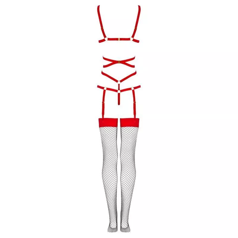 Das Oberteil des Sets besteht aus sexy schwarzen Streifen, die auf dem Bauch ineinander verschlungen und mit Ringen verbunden sind. Die Träger oben umschließen die Brust elegant, ohne sie zu bedecken, während sie sich unten sanft in einen Tanga verwandeln. Einzelne Träger verlaufen an beiden Seiten des Tangas und schmiegen sich charmant an die Hüften. Der untere Teil des Sets besteht aus schwarzen Strümpfen mit verstellbarer Länge aus Netzstoff. Die Strümpfe sind vorne und hinten mit Verschlüssen am Oberteil des Outfits befestigt.