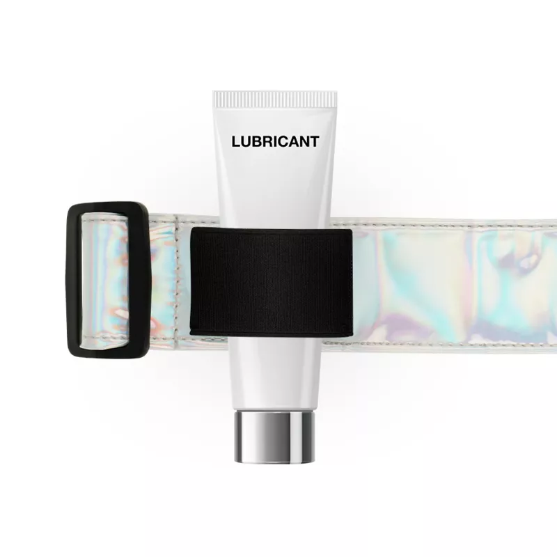 Das Geschirr hat an den Seiten ein elastisches Band, an dem die „Watchme“-Fernbedienung, eine Flasche Gleitmittel, Öl oder was auch immer Sie bevorzugen, befestigt werden kann. Dieses Gummiband wird auf Hüfthöhe auf beiden Seiten des Körpers angebracht, sodass es sowohl von Rechts- als auch von Linkshändern bequem verwendet werden kann.