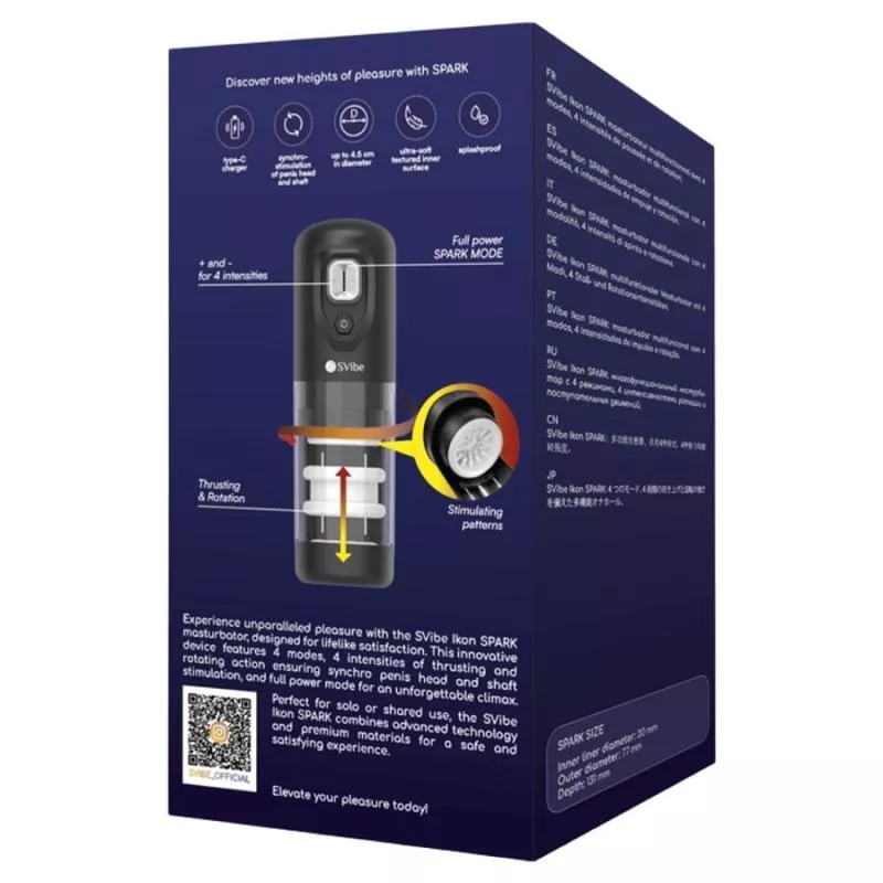 Der SVibe Ikon SPARK wurde entwickelt, um ein kraftvolles und äußerst realistisches Lusterlebnis zu bieten, indem er perfekt synchronisierte Stoß- und Rotationsbewegungen kombiniert. Seine verschiedenen Modi und Intensitätsstufen stimulieren gleichzeitig Eichel und Schaft und erzeugen so dynamische, intensive und hochgradig befriedigende Empfindungen.