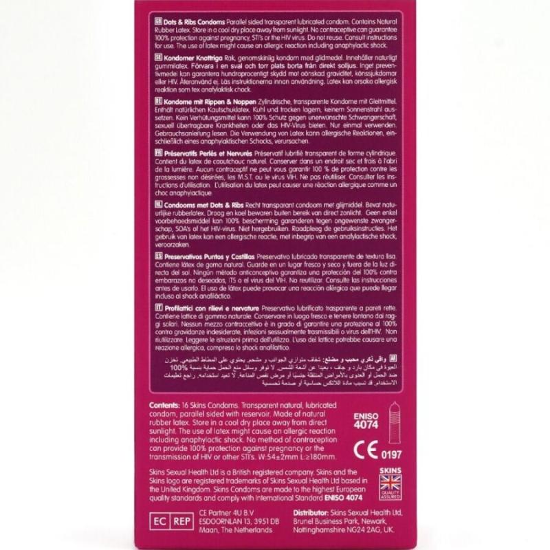 Skins kombiniert strategisch platzierte Rippen für gesteigertes Vergnügen mit zarten Noppen für intensivere Empfindungen beim Partner. So wird das Vergnügen und die Freude beider Partner in intimen Momenten maximiert. Skins Dots & Ribs Kondome bestehen aus hochwertigem Naturlatex für ein verbessertes, langlebiges und transparentes Gefühl. So dünn, dass sie sich wie eine zweite Haut anfühlen! Nie wieder ohne Skin! Bei richtiger Anwendung reduzieren Skins Dot & Ribs das Risiko einer Schwangerschaft und sexuell übertragbarer Infektionen erheblich, obwohl keine Verhütungsmethode 100%igen Schutz bietet.