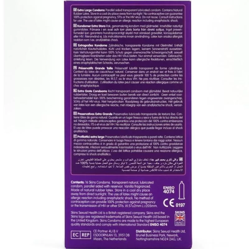 Wir präsentieren die Skins Extra Large 16er-Packung, ein verkaufsfertiges Format, das bis zu 33 % mehr Kondome pro Packung bietet als der Marktführer. Es wurde speziell für Kunden entwickelt, die eine großzügigere Passform ohne Kompromisse bei Komfort und Qualität wünschen. Die Skins XL-Kondome wurden durch direkte Verbrauchertests entwickelt und mit dem Input einer Gruppe gut bestückter Männer entwickelt, die die marktführenden großen Größen bewerteten, um die ideale Passform zu bestimmen. Das Ergebnis: Ein Umfang von 57 mm und eine Länge von 205 mm für optimalen Komfort, Sicherheit und Leistung. Hergestellt aus hochwertigem Naturlatex, sind diese Kondome ultradünn und dennoch strapazierfähig und bieten ein natürliches Gefühl wie eine zweite Haut.