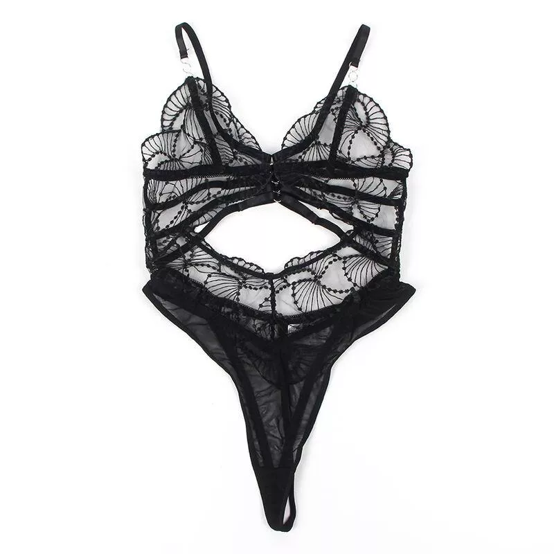 Das Design enthält transparente Spitzendetails, die einen Hauch von Zartheit und Raffinesse verleihen, während die strategischen Hohlschnitte die Silhouette betonen und die Haut auf subtile und verführerische Weise enthüllen. Die Kombination aus Spitze und Schwarz, klassisch und zeitlos, verleiht einen Hauch von Geheimnis und Raffinesse, der nicht unbemerkt bleiben wird.