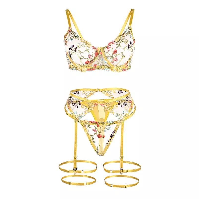 SUBBLIME - BH-String-Strumpfhalter-Set Blumen Gelb L/XL