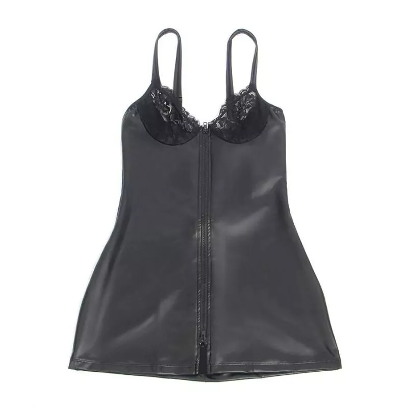 Das auffälligste Detail ist der Reißverschluss vorne, der einen Hauch von Gewagtheit verleiht und es Ihnen ermöglicht, mit der Öffnung zu spielen, um einen noch verführerischeren Look zu erzielen. Strategische Spitzentransparenzen deuten subtil auf die Haut hin, während das Material mit Vinyl-Effekt einen Hauch von Rebellion und Raffinesse verleiht.