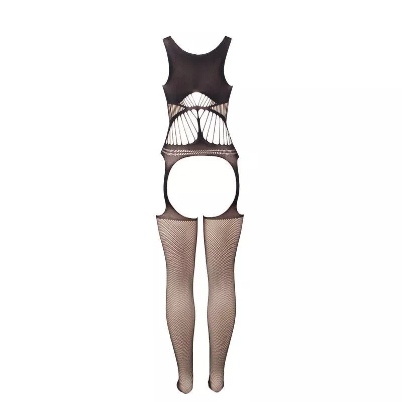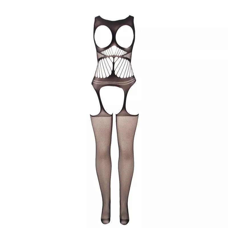 • Stil: Schwarzer Netz-Bodystocking mit schrittoffenem Design, mit nackter Brust und Schultern.