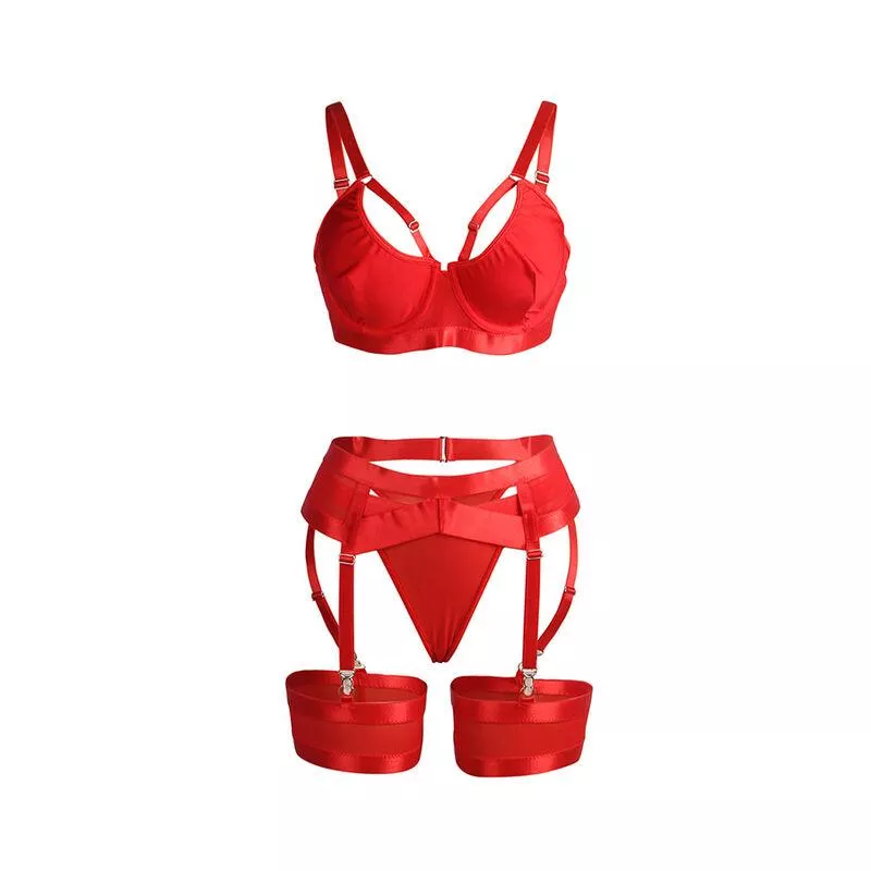 Das Design verbindet Funktionalität und Sinnlichkeit mit raffinierten Oberflächen, die sich durch ihre Vielseitigkeit und optische Attraktivität auszeichnen. Dieses rote Set, ein Symbol der Leidenschaft und des Verlangens, ist perfekt, um in einer intimen Nacht zu überraschen oder als Statement-Stück in Ihrer Dessous-Kollektion.