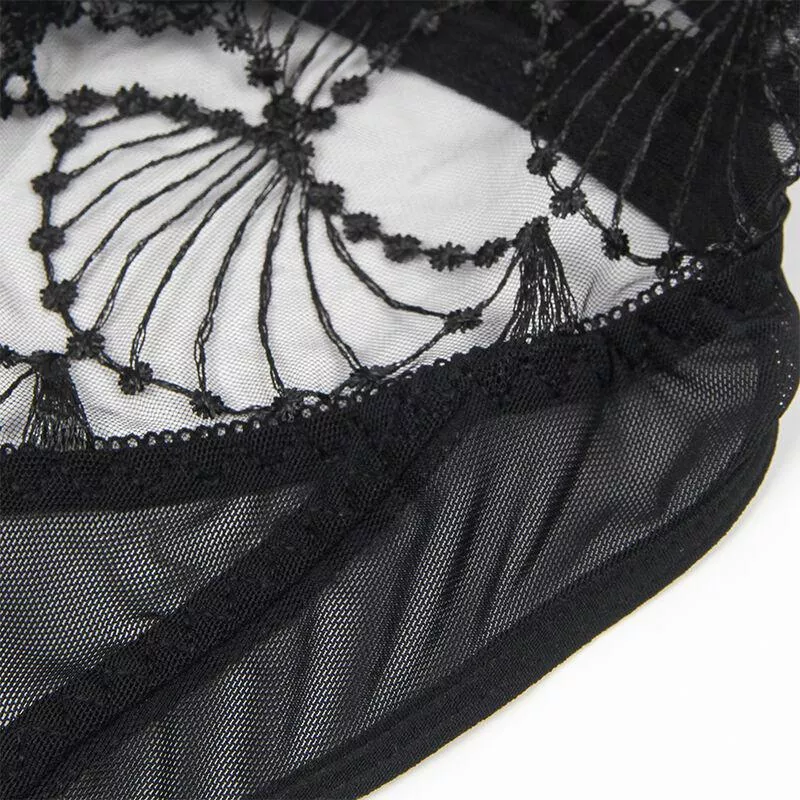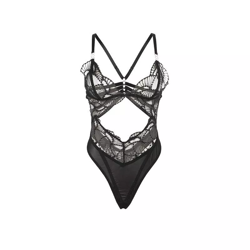 Das Design enthält transparente Spitzendetails, die einen Hauch von Zartheit und Raffinesse verleihen, während die strategischen Hohlschnitte die Silhouette betonen und die Haut auf subtile und verführerische Weise enthüllen. Die Kombination aus Spitze und Schwarz, klassisch und zeitlos, verleiht einen Hauch von Geheimnis und Raffinesse, der nicht unbemerkt bleiben wird.